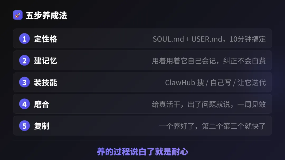 磨合期多长?我自己的感觉大概3到7天。3天之后犯错明显少了,7天之后出来的东西差不多能用,改改词就行。很多人第一次翻车就放弃了,但其实离一个好用的agent,可能也就差几次纠正的事。