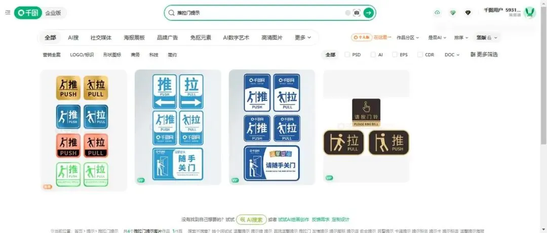 我的方法是“场景+提示”组合搜索。比如我这次的需求,直接搜的就是“小心夹手 温馨提示”或者“推拉门 提示”。这样一来,搜索结果的匹配度非常高,几乎第一页就能找到好几个符合我预想的模板。