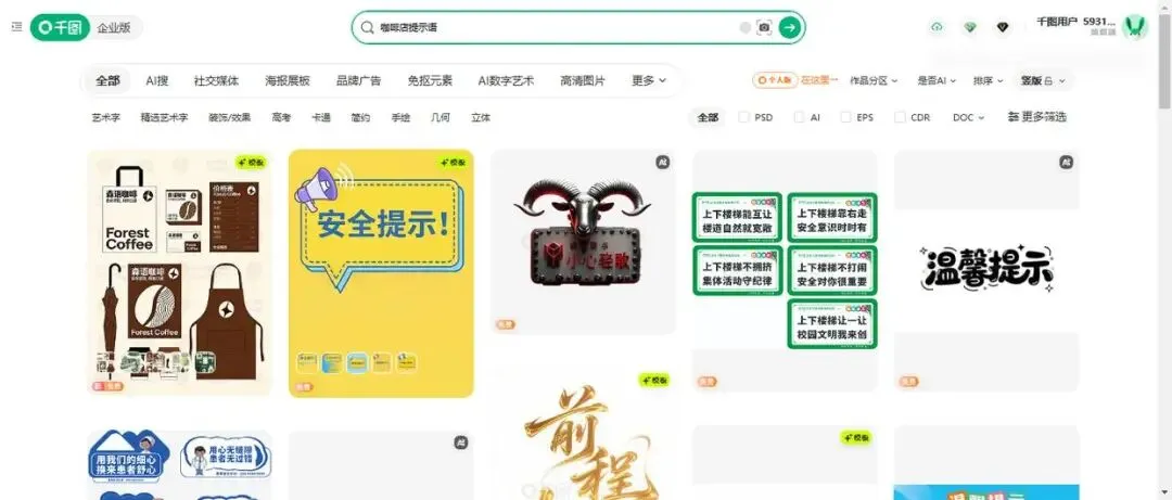 打开千图网,我没有直接搜“温馨提示”这四个字,因为我知道这样出来的结果会非常宽泛,什么“节约用水”“保持安静”都会混在一起,筛选起来太费劲。