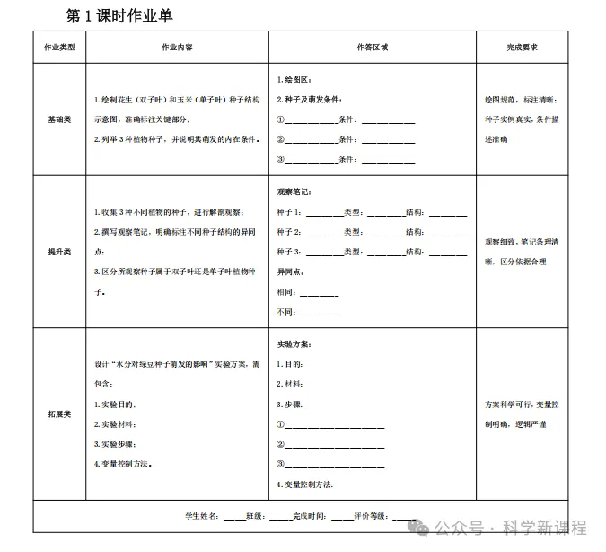 本作业设计聚焦“植物生长依赖适宜的环境条件,各器官具有特定功能且相互配合完成完整生命周期,种子传播保障物种延续”这一核心概念,严格遵循“双减”政策要求,以 8 课时知识脉络为依托,结合学生在基础知识、能力水平和生活经验上的实际情况,构建“基础+提升+拓展”三级作业体系。控制作业时长,避免机械重复任务,通过生活化、探究性任务设计,让学生在实践中内化知识、系统巩固知识要点,提升观察实验能力、科学思维能力和实践创新能力实现“减负不减质”。