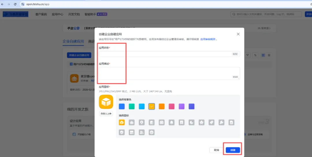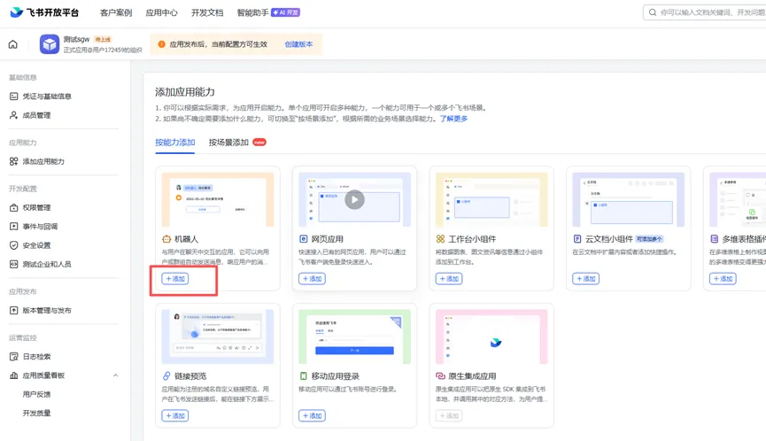 打开 飞书开放平台,登录后点击“创建应用”。 填写应用名称、描述等信息(可以随便填,后续可改)。 创建成功后,进入应用详情页,点击左侧“添加机器人”能力。