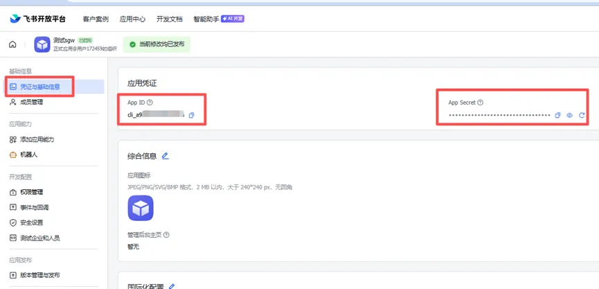 在左侧“凭证与基础信息”中,记录下 App ID 和 App Secret,后面要用。