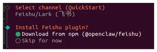 Download from npm (@openclaw/feishu)等待插件下载安装,然后输入之前获取的 App Secret 和 App ID(注意顺序!先 Secret 后 ID)。