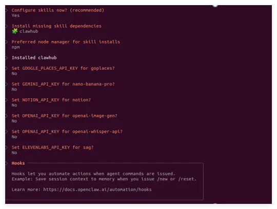 选好npm后 到 installed clawhub安装后直接回车,后面选择