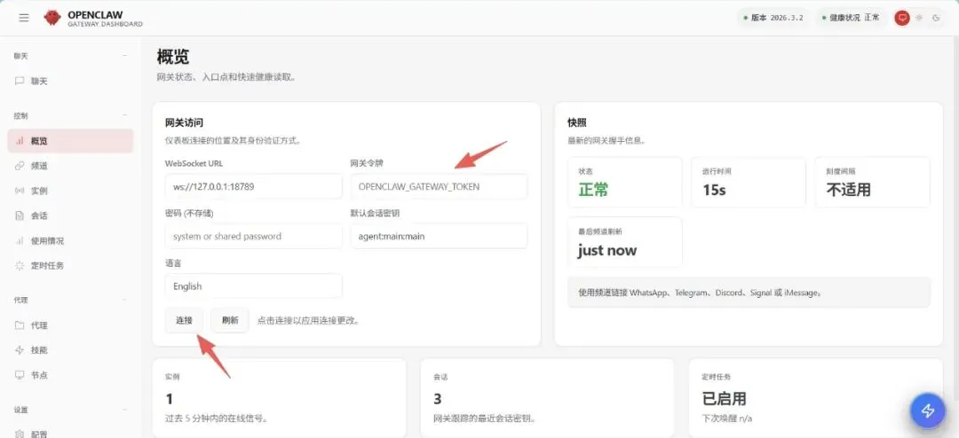 在终端运行下方命令, 它会输出一串 token。 openclaw dashboard --no-open复制 token,回到浏览器页面,在设置中找到“令牌”输入框,粘贴进去,点击连接即可。