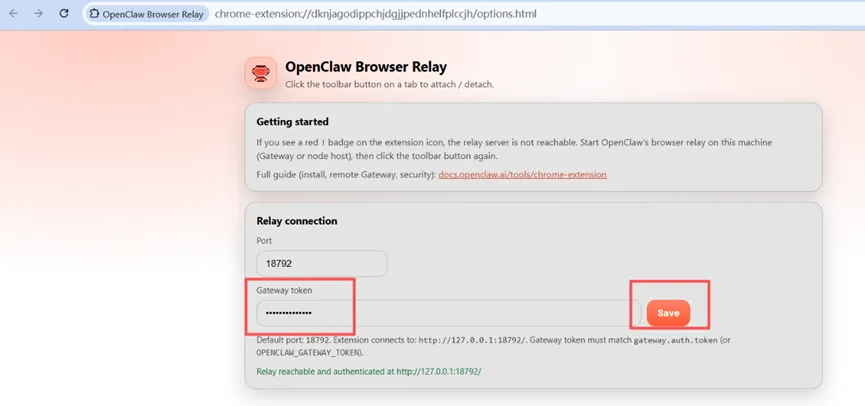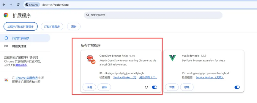注意:插件页面不能关闭,否则 OpenClaw 无法控制浏览器。在你想要控制的网页上,确保插件处于“开启”状态。
