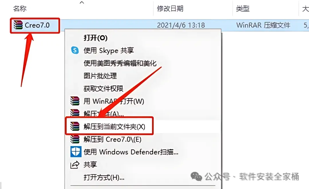 1.打开下载的Creo7.0软件安装包,鼠标右击压缩包选择【解压到当前文件夹】。