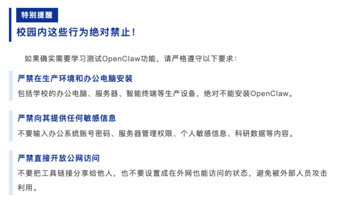 国家互联网应急中心及工信部已发布风险提示,明确“龙虾”默认安全配置脆弱,即使更新至最新版本,也无法完全消除安全隐患。对于存储大量科研数据、学生信息的高校而言,其风险更是难以承受。