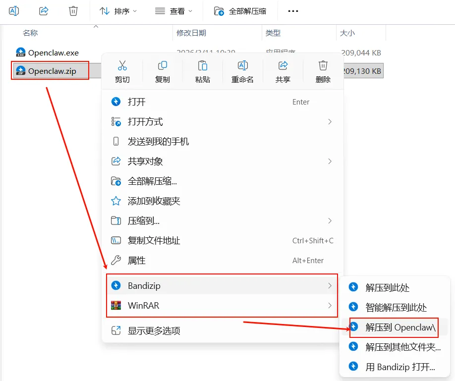 1.选中下载好的安装包,鼠标右键解压到“Openclaw”文件夹