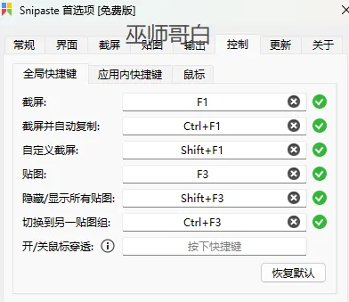 精准截图,足够顺手:F1 启动截图,边缘能自动识别界面元素,也支持延时和取色。