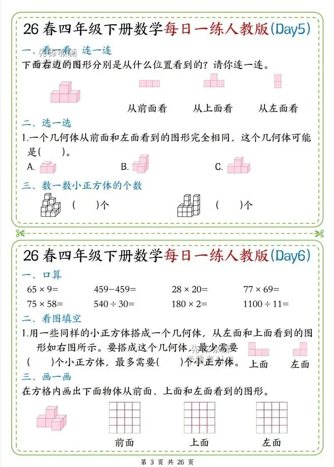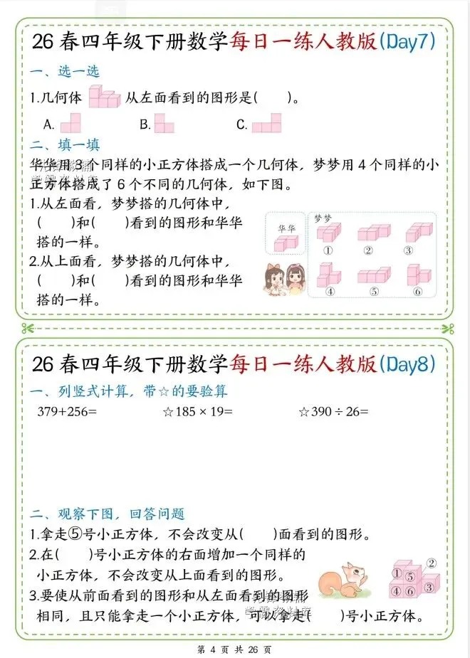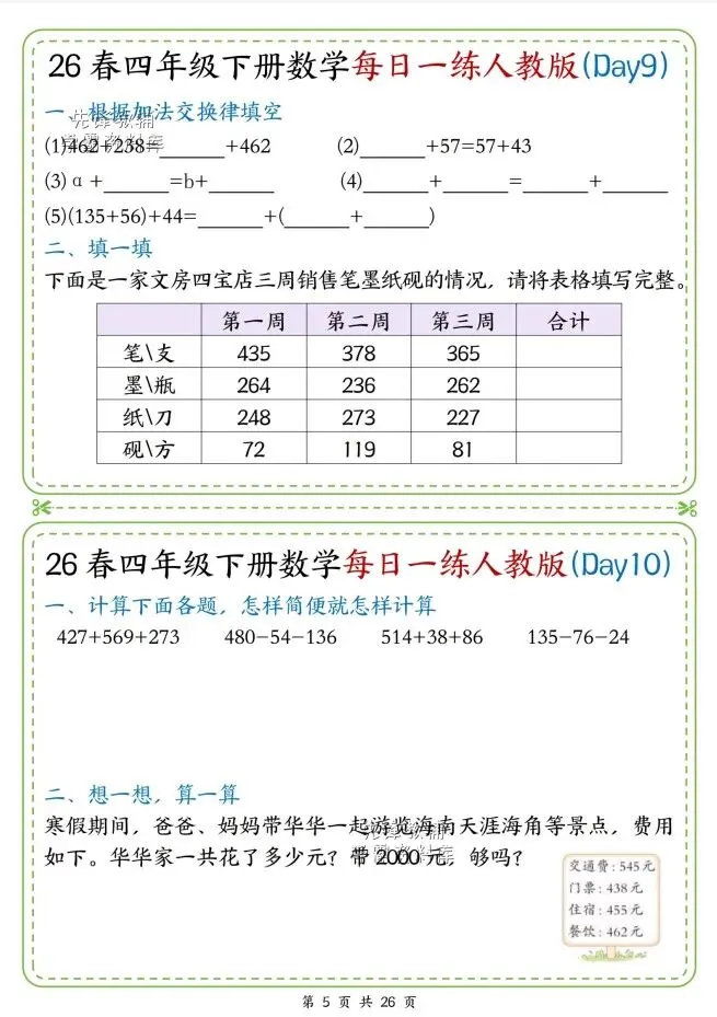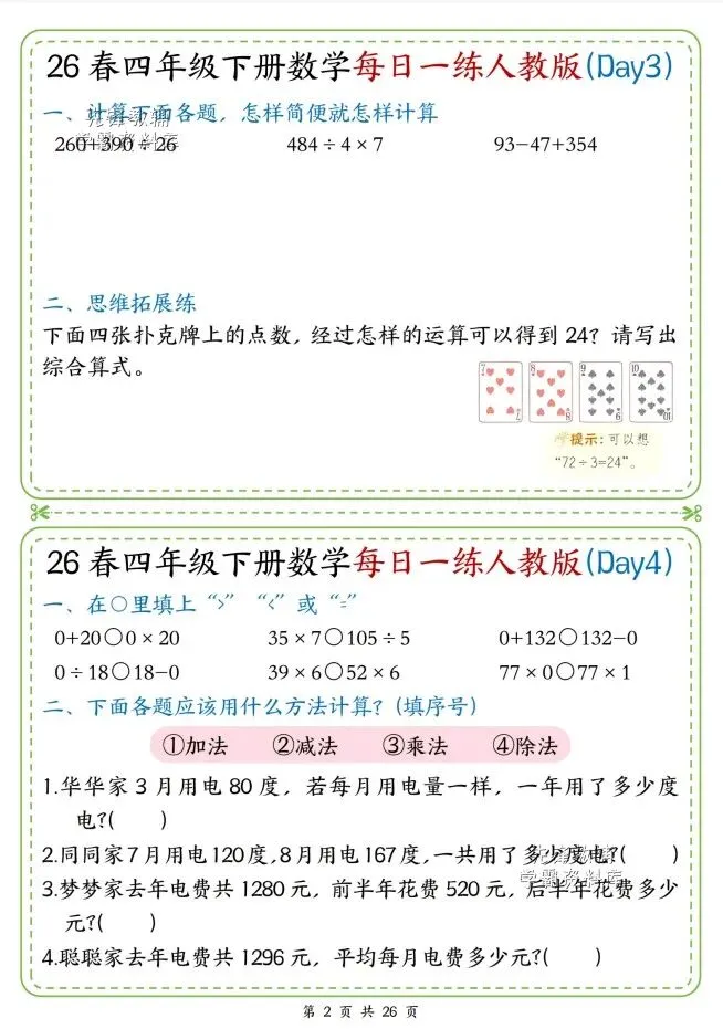今天给大家整理了26春四年级数学人教版下册每日一练,转发给朋友或班级群,受益更多人,帮助孩子学习!
