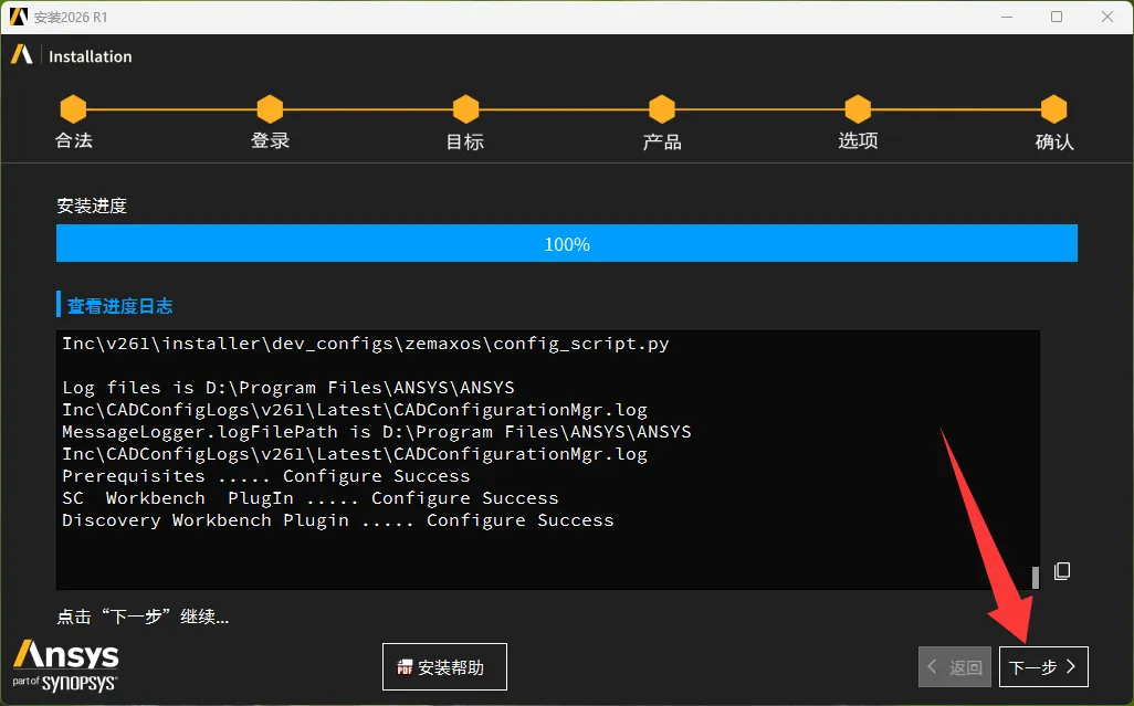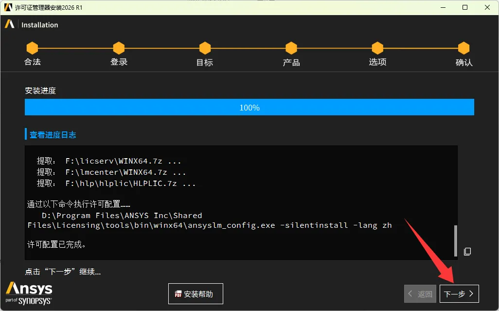 9、安装进度100%后点击下一步。
