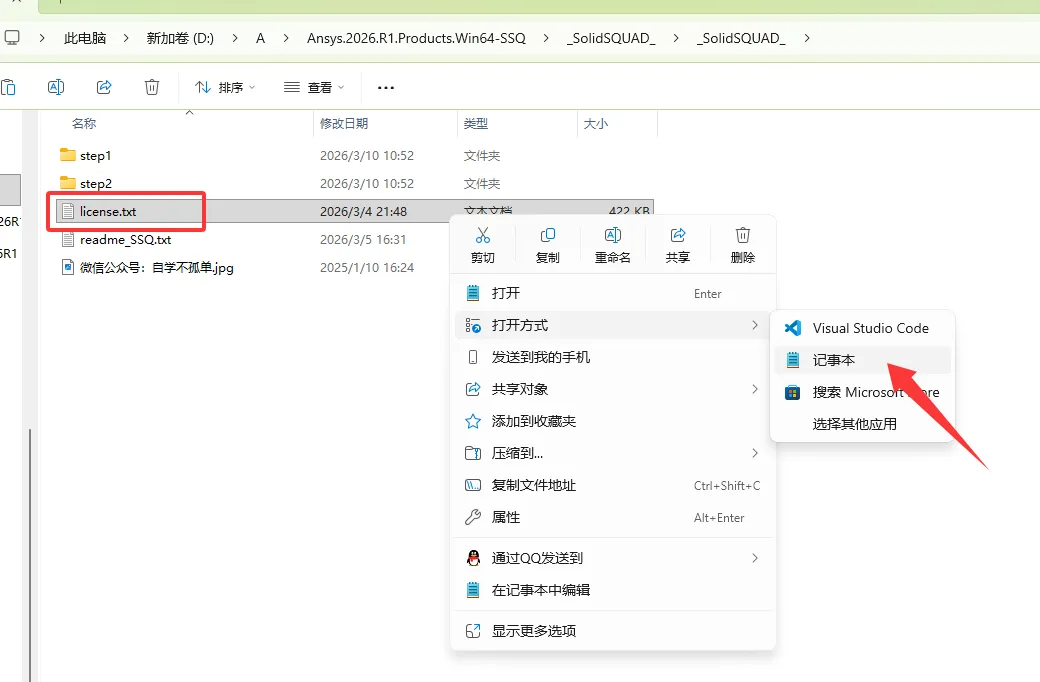 16、打开安装包补丁文件夹,用记事本打开license文件。