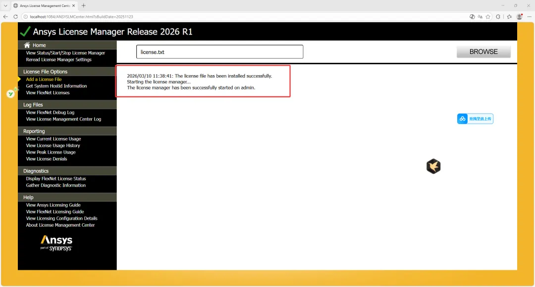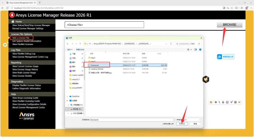 18、选择Add a license file,点击浏览选择上一步保存的license文件。