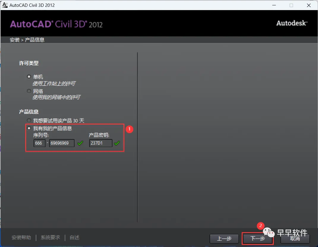 7、序列号输入:666-69696969,产品密钥输入:237D1,再点击【下一步】