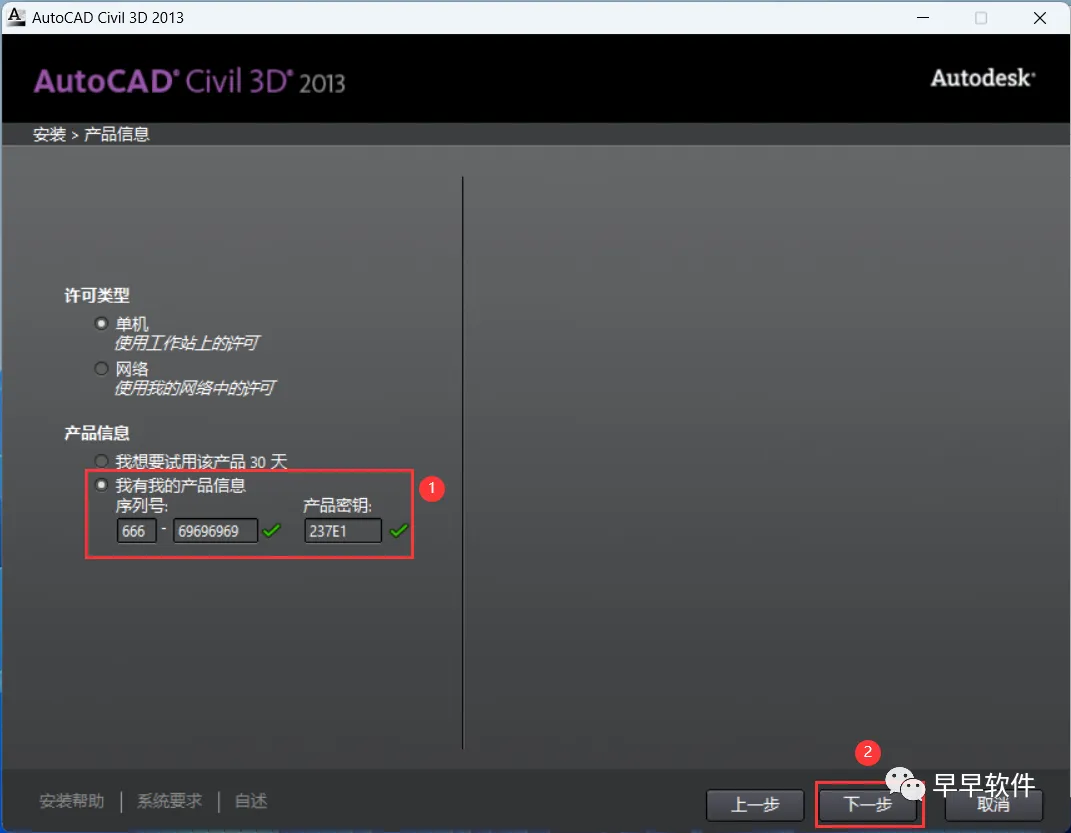7、序列号输入:666-69696969,产品密钥输入:237E1,再点击【下一步】