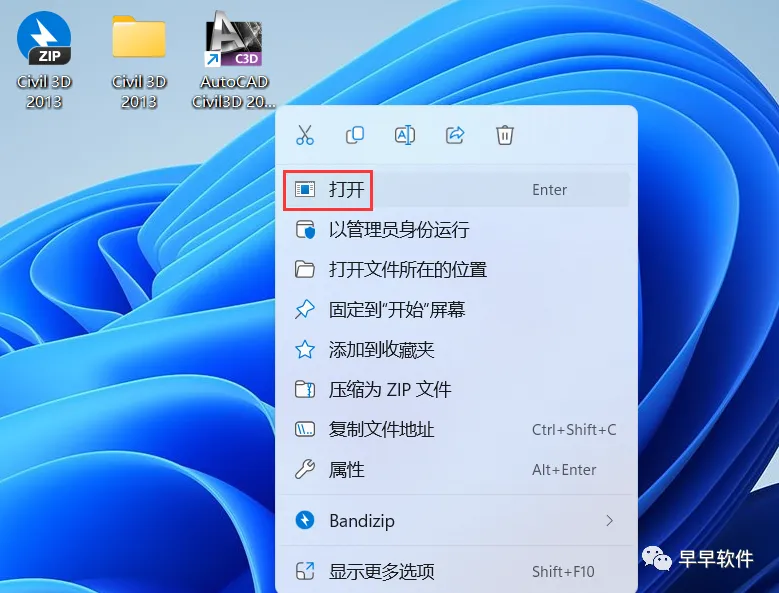 11、回到桌面,右键桌面上的【Civil 3D 2013软件图标】,点击【打开】