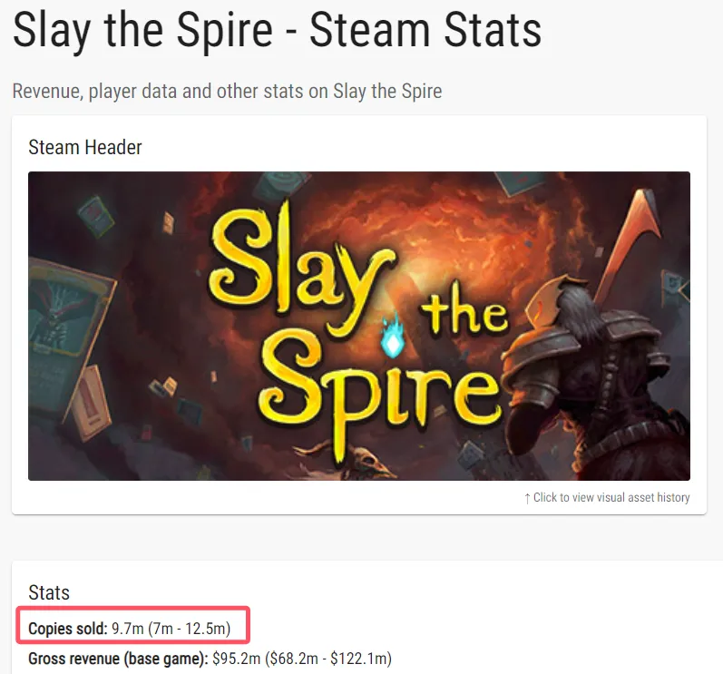 截至现在,初代的《杀戮尖塔》在Steam上已经有了超过18万条玩家评测,好评率常年稳定在97%-98%的好评如潮级别,业内通常按评论数反推,它的Steam销量大概在600万到1000万之间,再加上主机和移动端的战绩,全平台累计销量破千万,基本上也是板上钉钉的事。