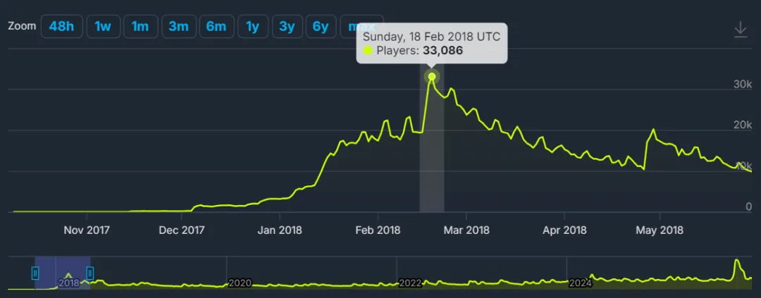 从Steam DB的历史数据来看,在他们视频发布后的不到两个月里,游戏的在线人数直接冲上了历史最高峰,而且纪录一直挂到去年的12月份,才被一波新史低促销打破。