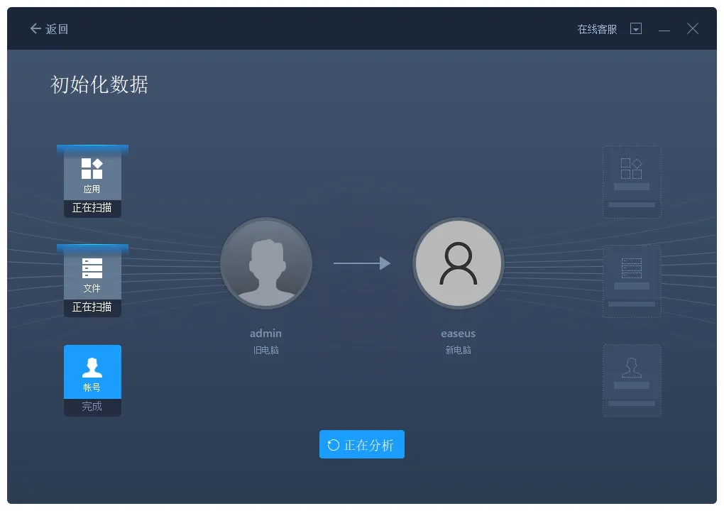 连接成功后,软件自动扫描旧电脑所有可迁移的应用、文件、账号、设置。