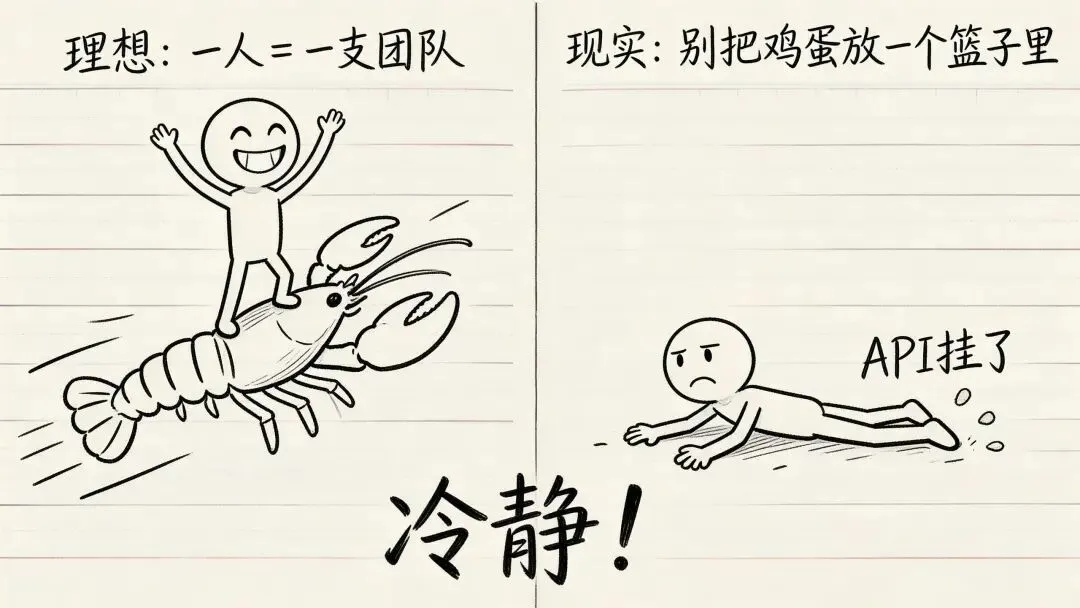 建议从副业开始,先验证模式再考虑全职。龙虾能帮你干活,但不能帮你扛焦虑。AI是工具,不是老板。你得有能力在没有AI的时候,也能活下去。