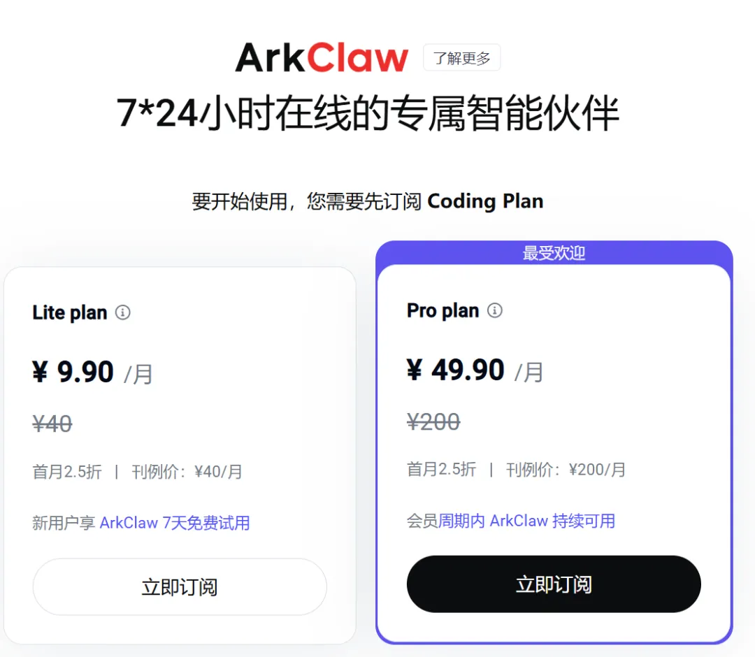 ArkClaw 也是网页端的一个方案,不过确实比上面AI大模型公司的价格,要便宜不少。