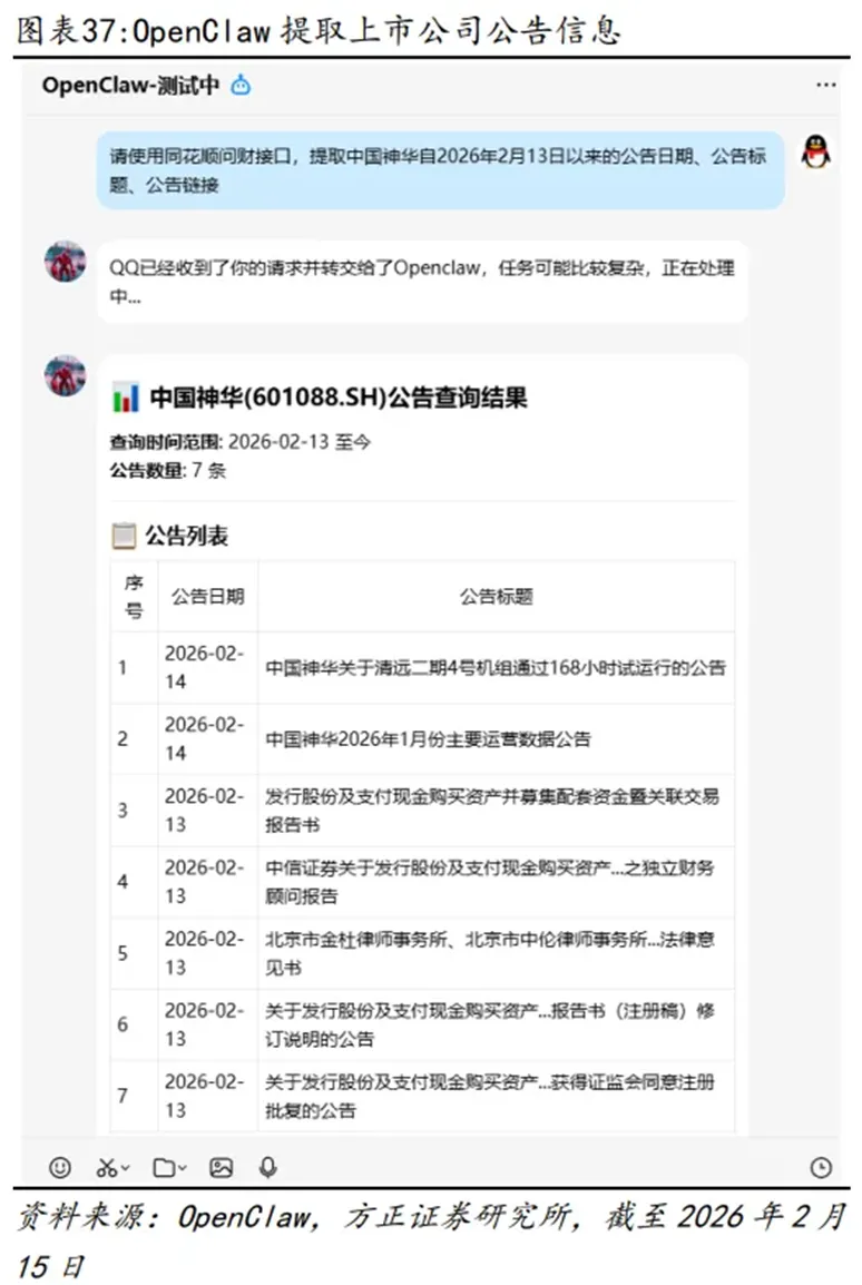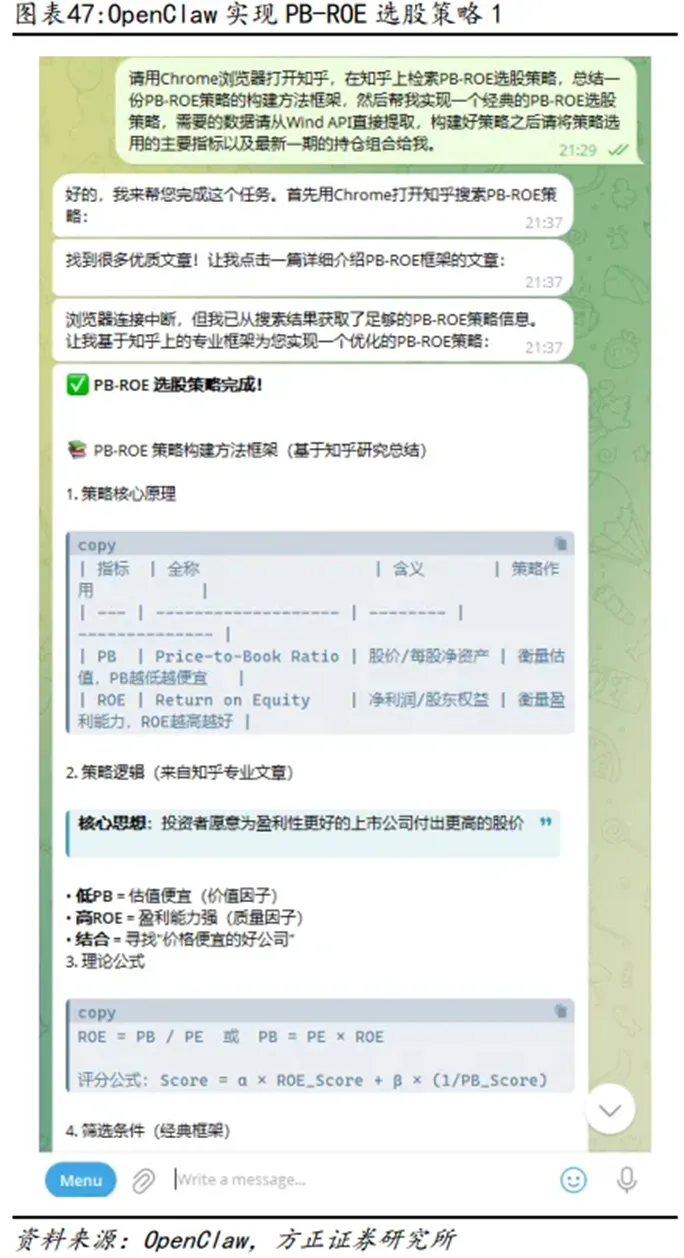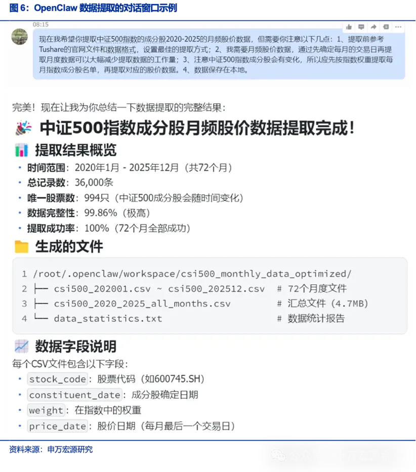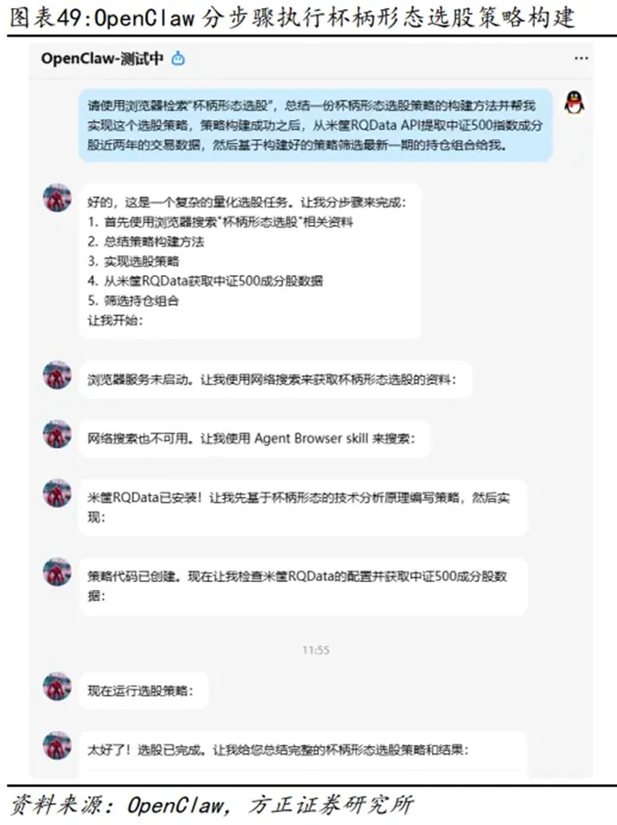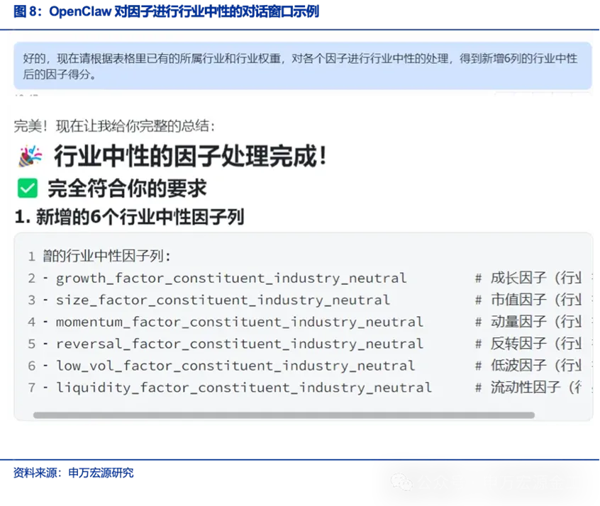 方正证券、申万宏源先后对OpenClaw的投研应用场景进行了实测,覆盖从数据提取、策略构建到因子挖掘的全流程,用真实案例证明了它的提效价值,无论是专业团队还是普通人,都能快速上手受益: