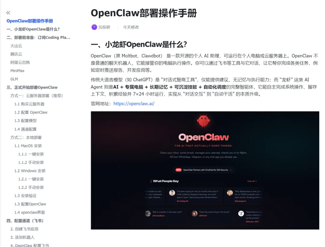 于是,我们打磨出了这份《OpenClaw部署操作手册》。这份手册目前聚焦「基础部署」和「飞书接入」——这是普通人解锁OpenClaw所有功能的基础,也是最关键的一步。