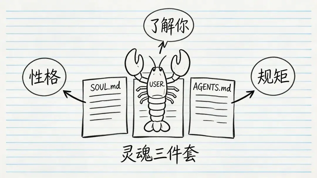 SOUL.md管"它是谁",USER.md管"你是谁",AGENTS.md管"怎么干活"。遵循"最小必要"原则,50行以内就够了——龙虾每次对话都要读一遍人设文件,写太长反而浪费Token。