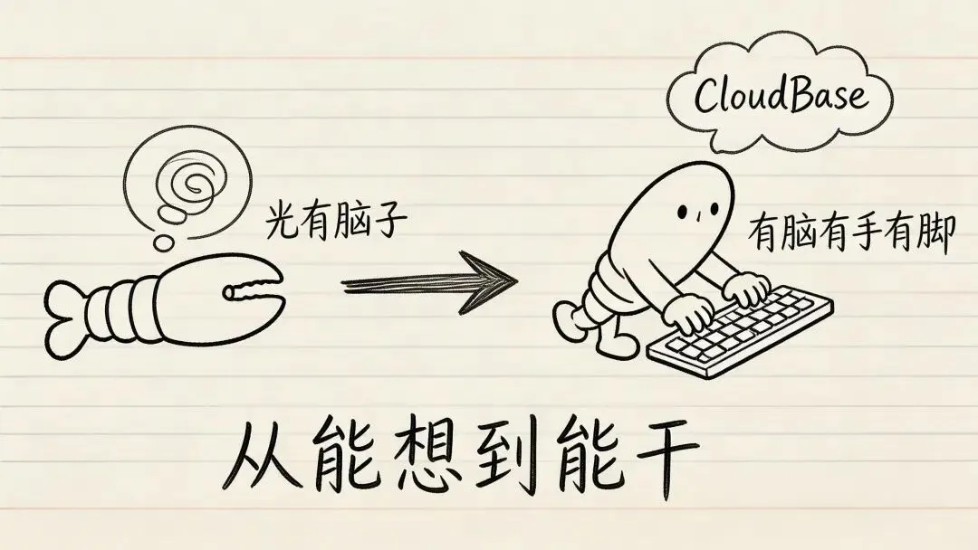龙虾是你的大脑。CloudBase是它的云端手脚。两个接上,一个人就是一支团队。