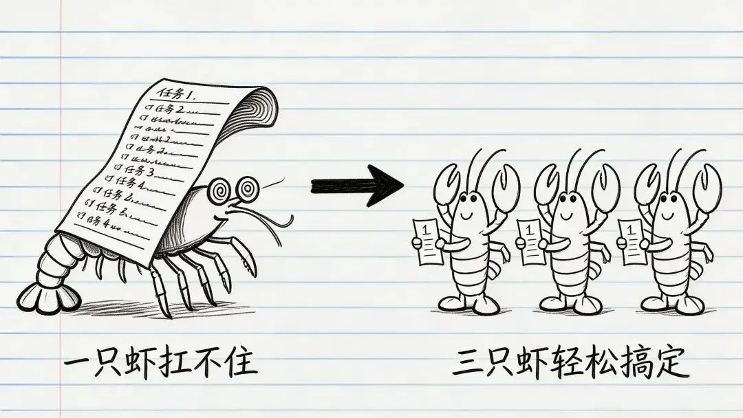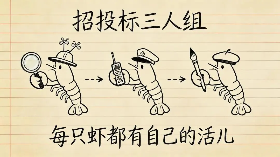 因为这本质上是三个岗位的活。解决方案不是让一只虾更强,而是让多只虾各司其职。
