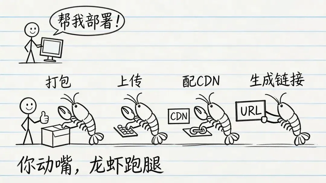 龙虾会写代码,但"会写代码"和"能上线"之间,隔着一条银河。前端、后端、数据库、CDN、HTTPS——以前至少需要3-5个人干2-4周。