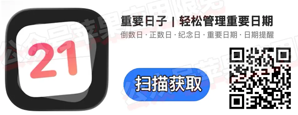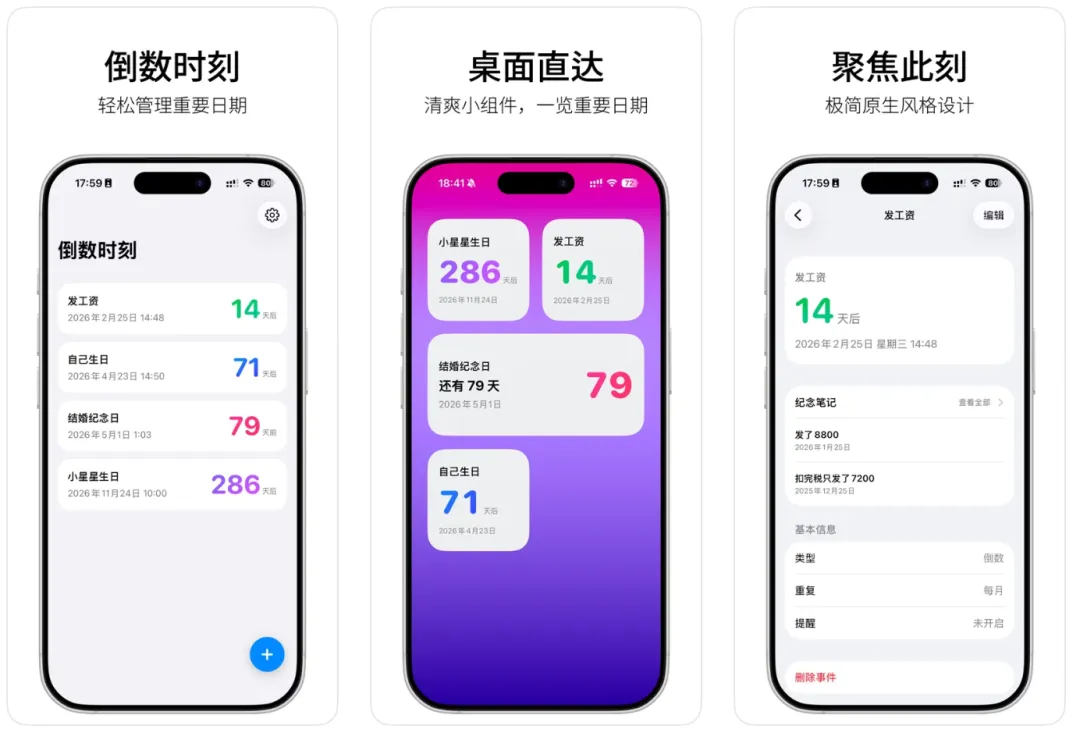 一款极简风格的生活提醒软件,支持倒数、正数、事项高亮、编辑、置顶、备注、删除等操作,支持桌面小组件,在主屏即可查看关键事件进度,设备需装有 iOS 17 或更高版本。