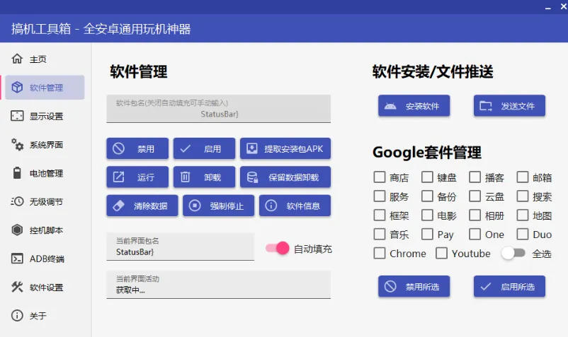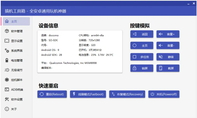 主页:可查看系统信息、快速重启指定模式、模拟按键。软件管理:实时获取前台软件包名,查看软件信息、强制停用系统软件,安装/卸载/保留数据卸载第三方软件,强制停止软件等显示设置:自由设置分辨率、DP、DPI系统界面:状态栏图标隐藏与布局管理,隐藏导航栏电池管理:获取电池信息,模拟电池数值、温度,模拟充电状态,自动统计电量无级调节:高精度调节系统字体大小、动画速度、自动锁屏时间控机脚本:基于《自动化助手》定制的全自动操作手机功能ADB终端:简易ADB控制台,可在软件设置里调节输入选项软件设置:更换配色、默认启动页等设置