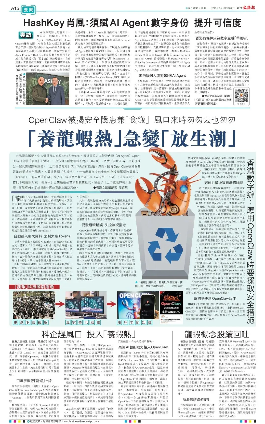 市場瞬息萬變,令人慨嘆風口來時匆匆去也匆匆。最近開源人工智能代理(AI Agent)OpenClaw(俗稱「龍蝦」)爆紅,一些內地互聯網龍頭如騰訊(0700)、百度(9888)等,早前也推出一鍵式雲端部署服務,「上門安裝龍蝦」成了內地熱門話題;然而,隨着OpenClaw被揭發有嚴重的網絡安全隱患,其實還是個「食錢怪」,一句簡單指令也會偷偷跑掉幾萬個流量單位(Tokens),有人開啟該AI才幾小時,賬單使用費便過千元(人民幣,下同)。有見及此,首批下載龍蝦AI的「養蝦人」已開始連夜尋求卸載該程式,催生了「上門徹底卸載」服務,而龍蝦AI的卸載指南也開始在網上廣泛流傳。
