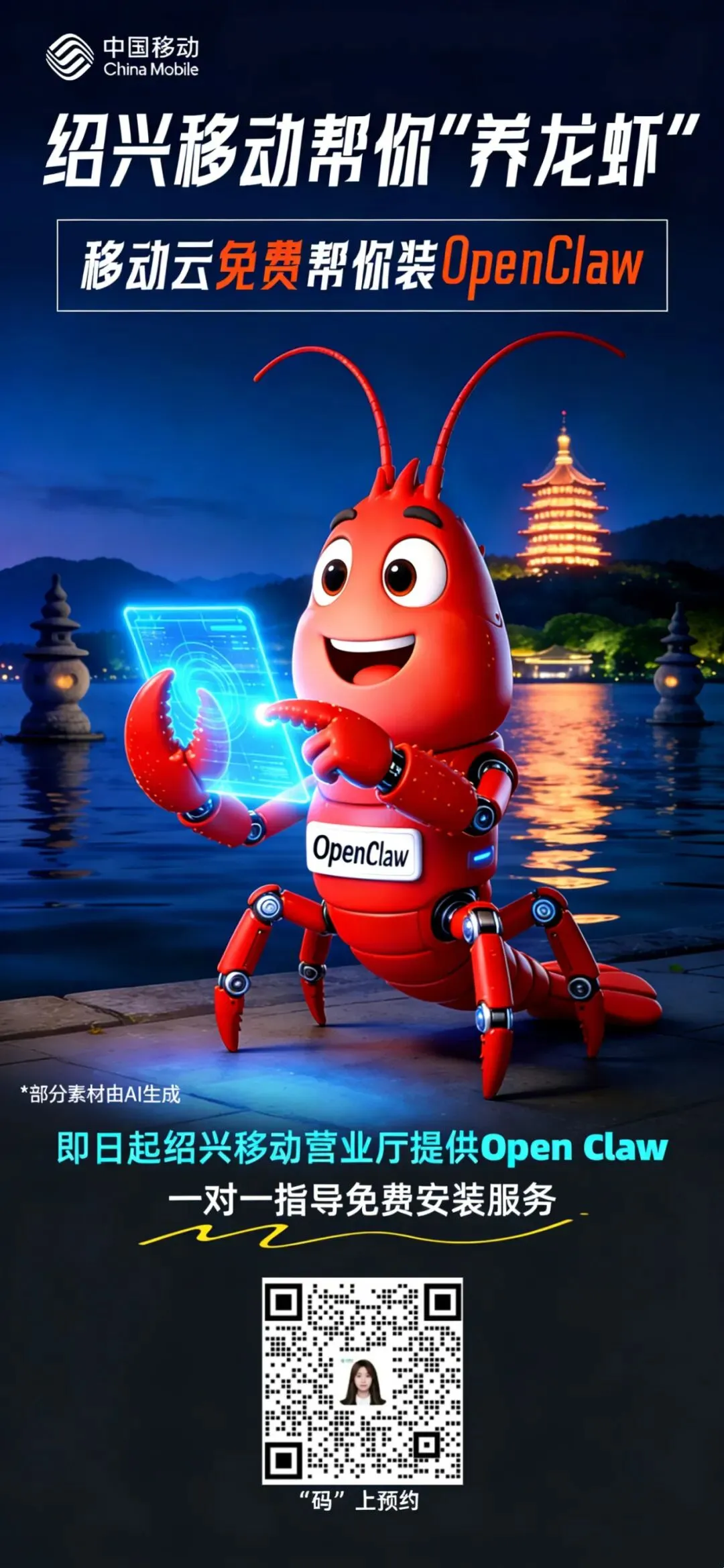 绍兴移动正式推出云电脑OpenClaw“养龙虾”免费安装部署活动,以云端化、低门槛、强赋能的全新方式,让市民轻松拥抱AI智能体时代。即日起用户前往绍兴移动指定营业厅,即可享受现场云电脑一对一免费安装部署指导,同步获赠一千万大模型Token,助力高效“养虾”,解锁工作生活新效率。
