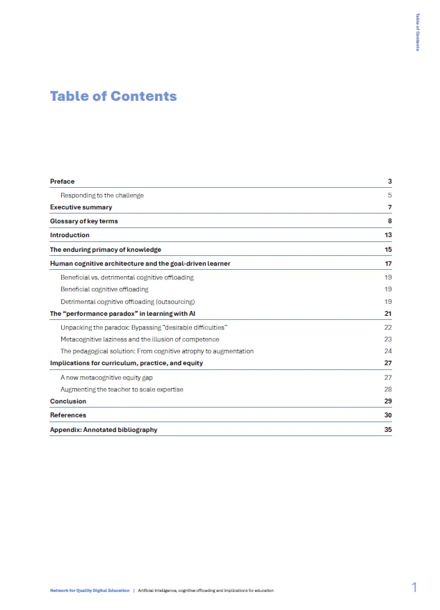 该报告是“澳大利亚优质数字教育网络”工作计划的成果,旨在确保所有学生都能从教育技术中获益并缩小学习差距 。报告从人类认知架构(如认知负荷理论)的视角出发,对人工智能时代教育面临的一个深刻的新挑战开展了调查。这个挑战就是“学生可能会将过多的认知工作“外包”给人工智能,而这些工作正是建立知识、技能和“思维基础设施”所必需的 。”