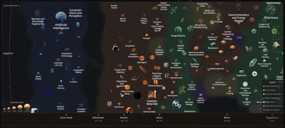 O-DataMap被硅谷投资人誉为“科研界的谷歌地图”,是一款由AI“论论全球”(OALL)驱动的全球首个可导航科技知识地图。它不是论文库,而是将全球数百万篇论文中的实验数据逐条提取、结构化,并投射到一张动态二维坐标系中:横轴代表研究尺度(从亚原子到宇宙),纵轴衡量研究阶段(基础→应用→商业化)。
