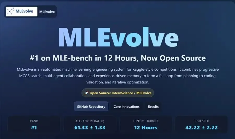上海AI实验室推出的MLEvolve,是首个实现“AI自主设计算法”的开源系统,12小时内就在MLE-bench(75道Kaggle真题)上登顶榜首——奖牌率达61.33%(±1.33%),高难度题表现更达42.22%,远超所有24小时基线方法,效率提升一倍。