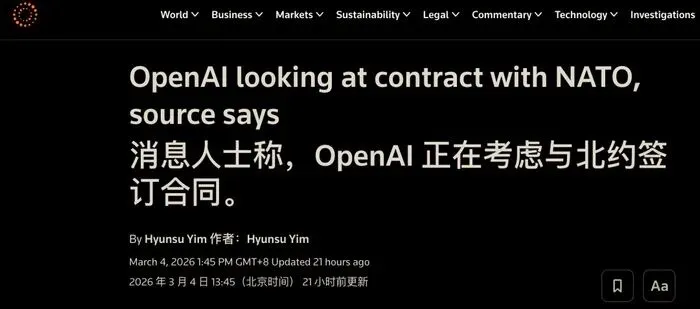 OpenAI近期动作频频,引发广泛担忧:继拿下五角大楼机密级AI合同后,又正积极谋求与北约(32个成员国)达成合作,目标直指其军事信息系统。据路透社和《华尔街日报》报道,OpenAI已明确接触北约,意图部署大模型至其网络——虽公关口径称仅限“非机密网络”。