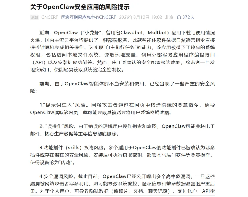 3月10日晚,国家互联网应急中心紧急发布《关于OpenClaw安全应用的风险提示》。紧接着,工业和信息化部也发出预警,直指这款工具存在的四大隐患:提示词注入可导致密钥泄露、误操作可能删除核心数据、恶意插件窃取信息、系统漏洞可被远程控制。