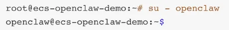 默认root用户 ,需要进行权限拉低,使用 su - openclaw 从 root 用户切换到 openclaw 用户,并配置密码