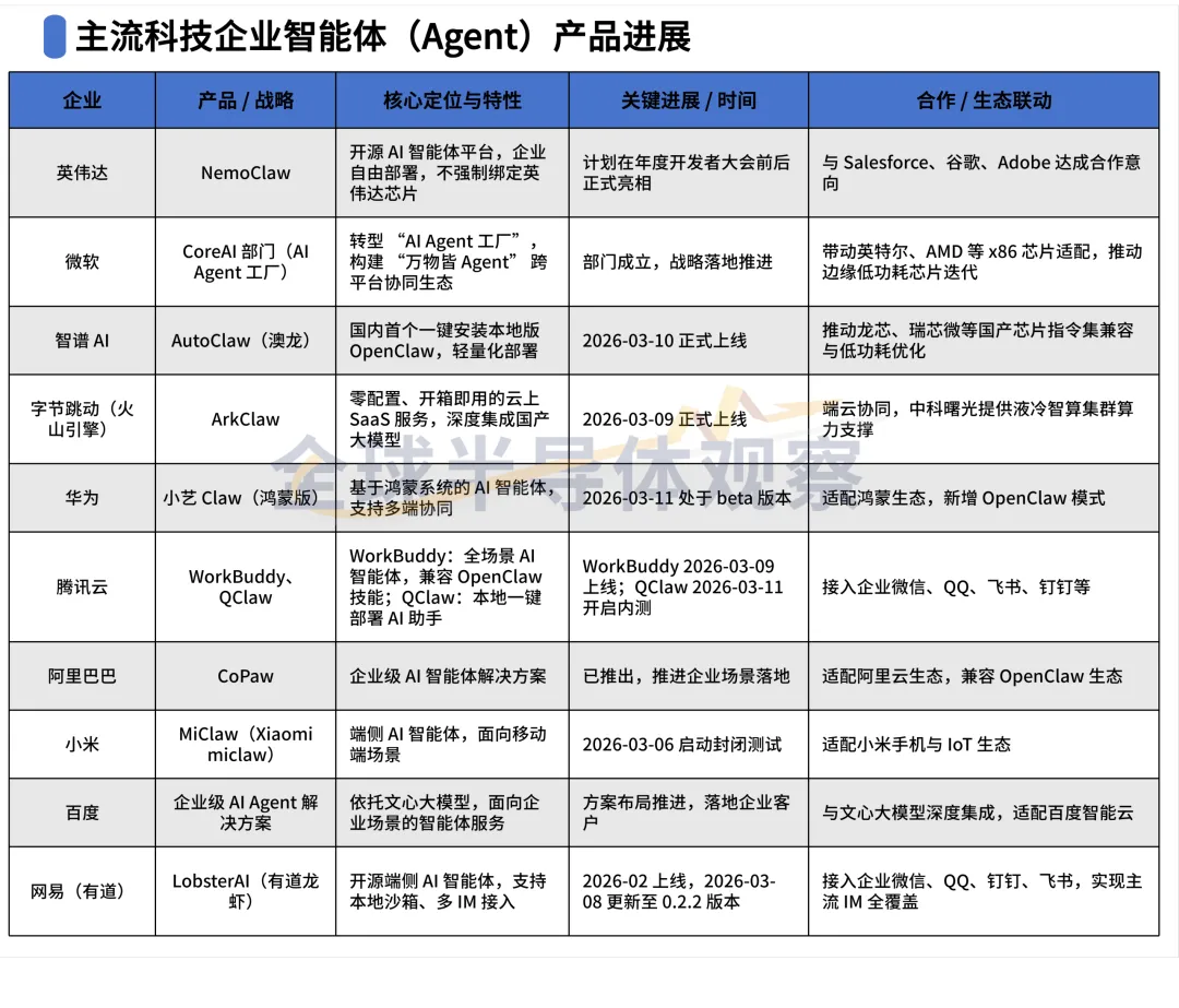 此外,华为推出基于鸿蒙系统的小艺Claw,目前处于beta版本;腾讯云上线WorkBuddy;阿里巴巴推出CoPaw;小米处于MiClaw封测阶段;百度依托文心大模型布局企业级AI Agent解决方案。国内科技大厂的全面入局,倒逼芯片企业在指令集兼容、算力优化、低功耗控制等核心领域实现突破,加速国产半导体产业的升级。
