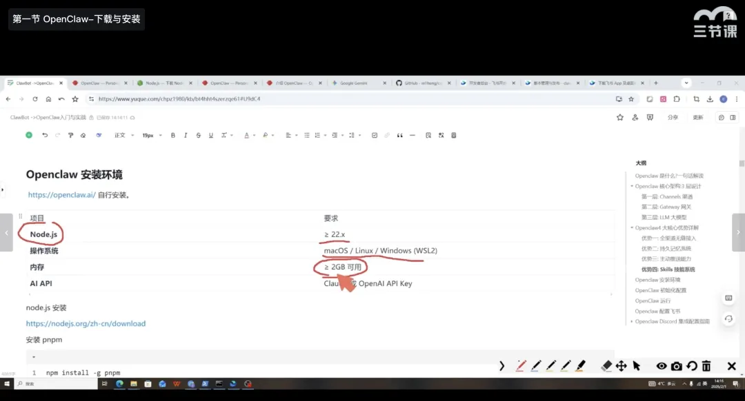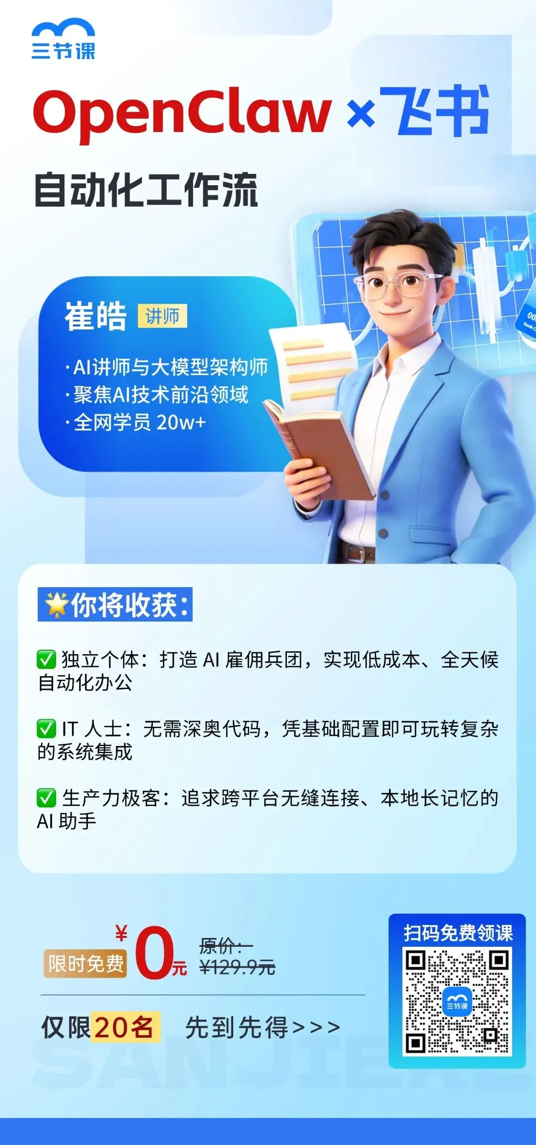 这门《OpenClaw×飞书的自动化工作流》实战课程共 4 章,内容从OpenClaw核心认知👉工具安装👉飞书实战👉团队搭建,一步步带你由浅入深的掌握OpenClaw,小白也能轻松跟上节奏!内容全是一线实战干货,分步骤演示教学,每一个操作都有详细讲解,把网上零散、踩坑的教程整合归一,帮你省去99%的试错时间,真正做到学完就能用、用了就提效。用大白话讲清“龙虾AI”的核心逻辑,不用懂专业术语,也能知道它到底能帮你做什么、怎么用,再也不用被复杂术语劝退;手把手教你Windows/Mac双平台安装配置,精准对接DeepSeek等主流模型,扫清安装报错、环境配置的所有坑;一步步教你完成飞书机器人、插件全流程配置,搭建飞书安全机制,让OpenClaw与飞书深度融合,真正融入日常办公。除了这些干货内容,课程还有一套完整的《OpenClaw入门实战文档》,帮你扩充对龙虾AI的了解和提高应用技能。不管你是普通办公族想摆脱复制粘贴、统计报表的重复活,还是创业者想低成本搭建AI团队,这门课的技能都能直接用,刚需又实用!本门课程的授课老师崔皓老师,是深耕AI与分布式架构领域18年的实战派专家,拥有10年分布式架构经验,被全网20w+学员验证过的靠谱讲师。还曾出版过《LangChain实战》《分布式架构原理与实践》等畅销书。跟着他学,你不用再到处找教程、不用反复踩坑,就能快速掌握OpenClaw全流程操作,轻松实现飞书集成,搭建专属AI虚拟团队,真正实现“一人即大厂”的生产力跃迁。现在扫码 0元 领课,就能跟着老师一起学习OpenClaw的实战方法。除了以上这门课程,三节课目前还有多门OpenClaw的课程。课程覆盖基础入门、使用技巧、开源部署、企业应用、技术原理等板块,适合不同阶段的同学来学习。能帮助大家快速了解OpenClaw,以及掌握OpenClaw的使用技巧~如果你对OpenClaw感兴趣,都建议先扫码0元领取课程,给自己一个尝试的机会👇