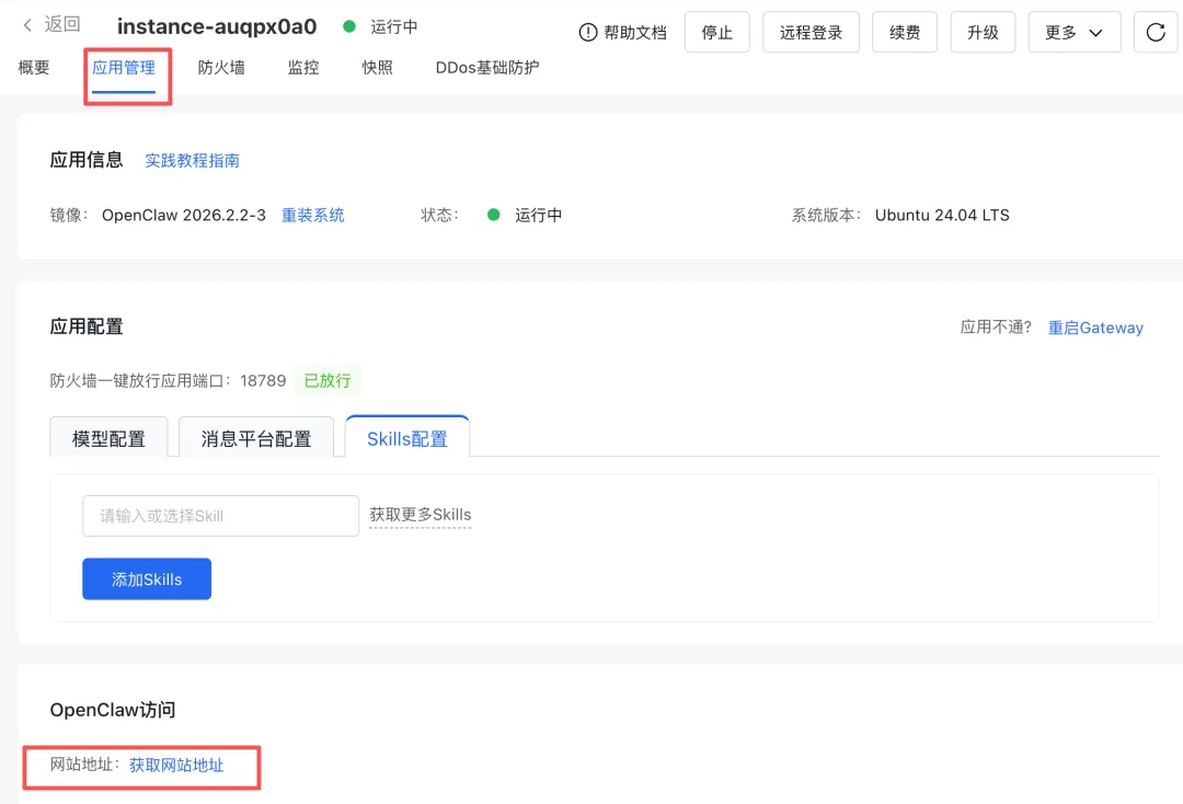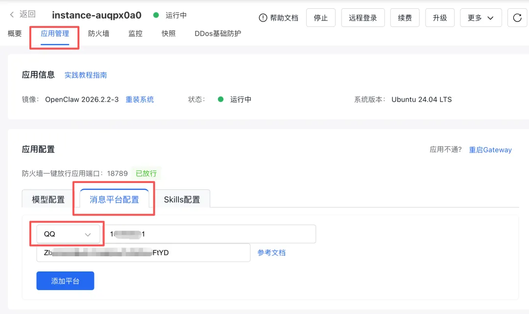 如果按照我之前写的 《OpenClaw 保姆级部署教程》 进行操作,已经在搭建 OpenClaw 时自动安装了 qqbot 插件。只需要在云服务器管理页面,找到 消息平台配置,下拉选择 QQ,把刚才的 AppID 和 AppSecret 填进去,点击应用,等它执行完就好了。
