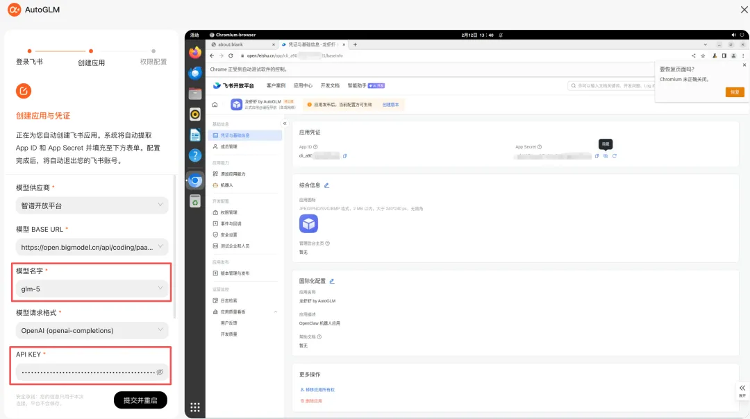 全程看着 AutoGLM 操作浏览器帮你安装就好、而且还能自动集成飞书机器人,真正的傻瓜式安装!