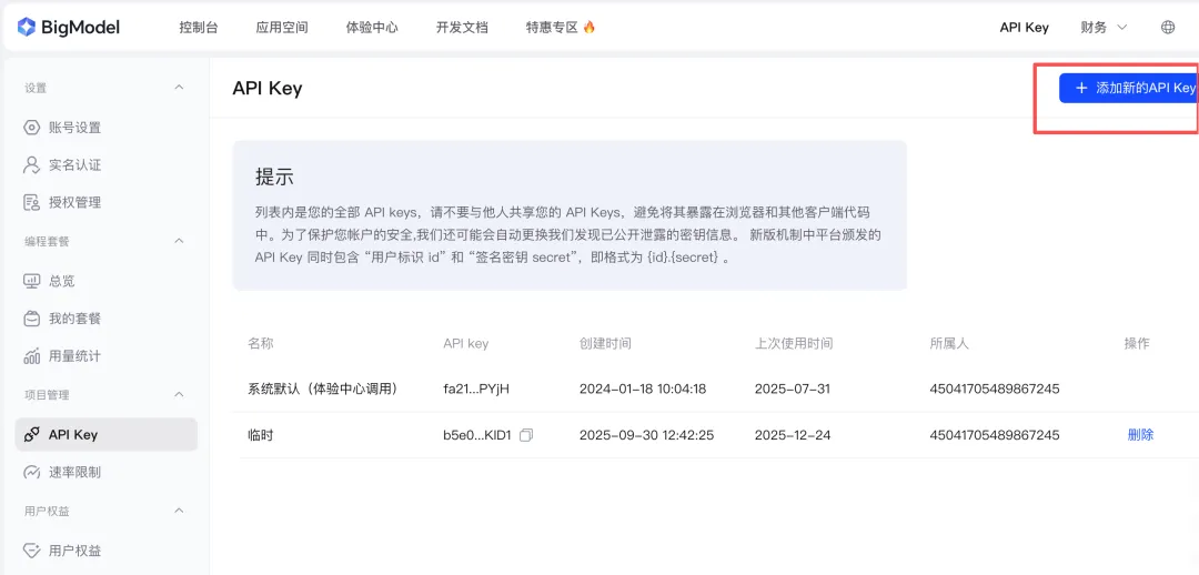 1)先登录到 智谱开放平台,在控制台的 API Key 页面获取到调用大模型的密钥: