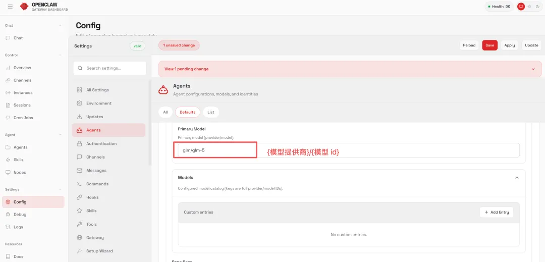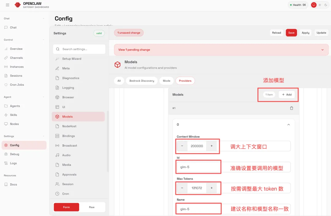 2)进入 OpenClaw 的管理页面,打开 Config 设置,点击 Models 修改模型配置。添加一个模型提供商 glm,填写 API 调用配置,包括 API 接口类型、API 密钥和调用地址 Base Url。