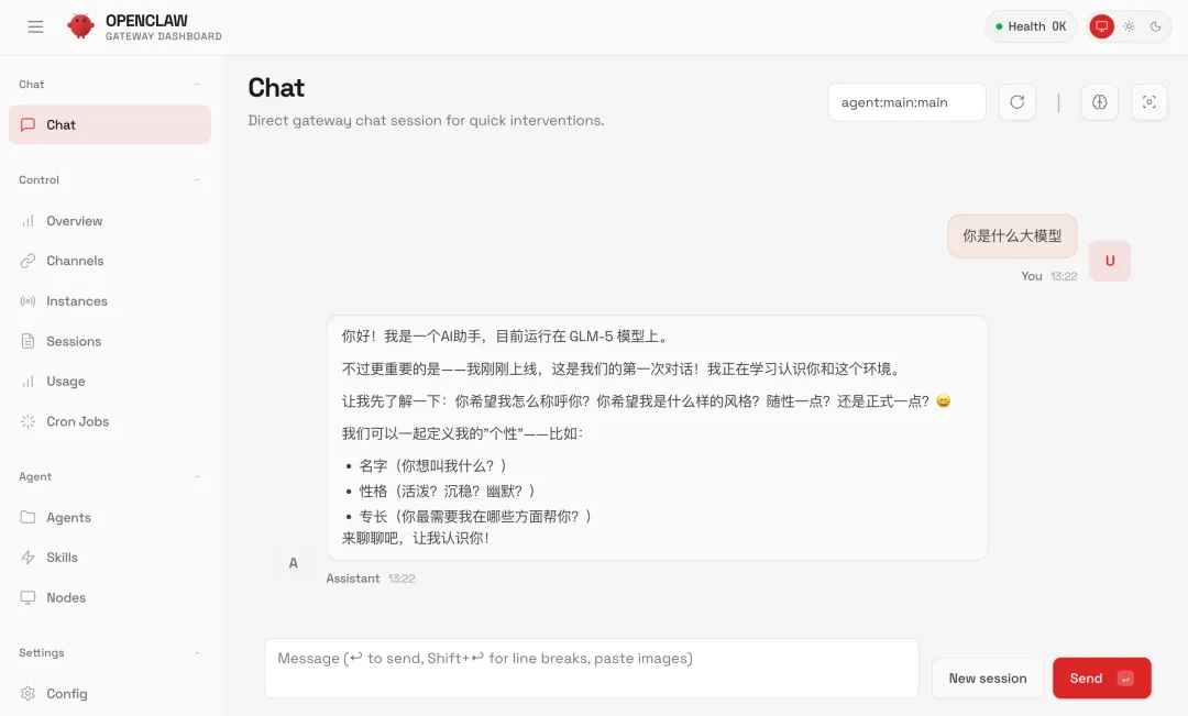 5)配置完成后,进入到 OpenClaw 的对话界面,和 AI 打个招呼,确认模型已经接入成功: