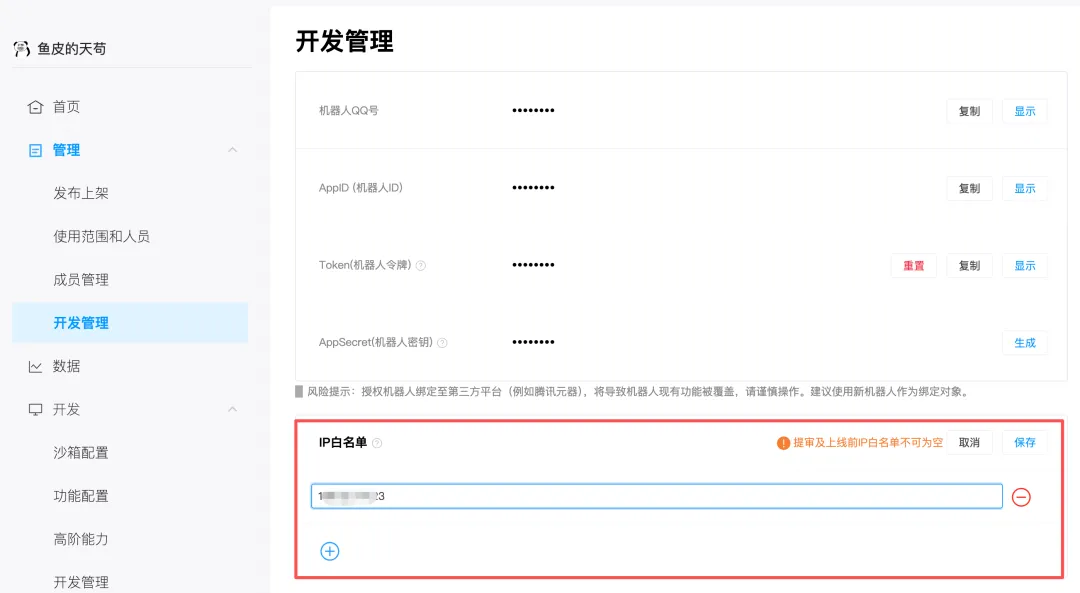 还要把你云服务器的 公网 IP 添加到 IP 白名单里,然后保存。
